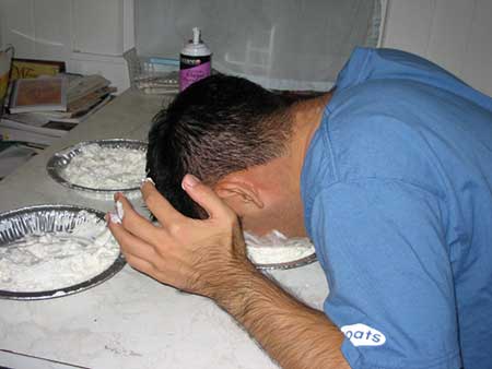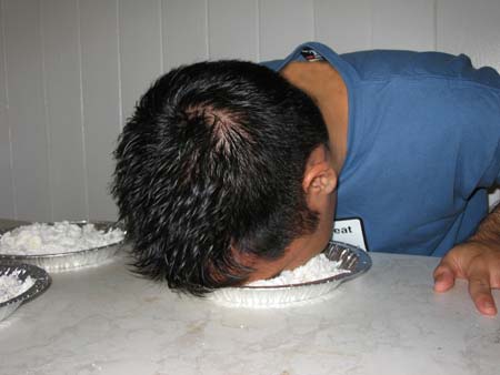 I would like to thank everyone who entered. And now here are the pictures — with lame high school yearbook-ish captions — of me pulling out the winning entries from canned whipped cream pies, using my mouth. Enjoy.