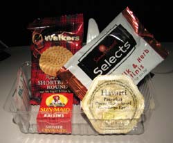 My snack pack consisted of a shortbread cookie, buttermilk and herb crackers, a box of raisins, and a small container of spreadable Havarti cheese.