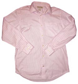 For thirty years of my life, I thought that way about wearing the color pink. I believed that pink was a color that only girls and really preppy Polo-wearing bastards should wear. But after picking up this pink-striped Banana Republic Outlet shirt for $24.99, I’m now beginning to see that pink can be very manly. After all, prime rib is pink…and very manly.