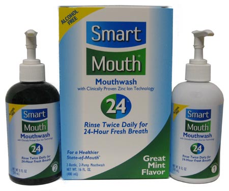 Each box of Smart Mouth mouthwash contains two separate solution pump bottles and a mixing cup. According to the box, mix four pumps from each bottle of solution into the mixing cup. Then rinse vigorously with the mild, minty mixture for 30-60 seconds, gargle and spit out. Repeat every morning and night.