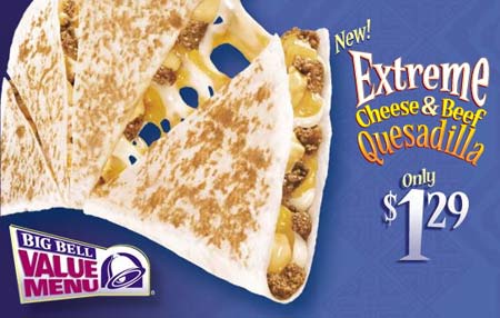 I’ve had their chicken and their steak quesadilla. This one sounds even more unhealthy. Maybe they could do “Xtreme Angioplasty” ads to go along with the extra nacho cheese sauce.