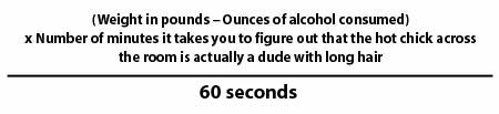 Your answer will end up being in minutes. So lets say you’re 160 pounds minus the 60 ounces of Bud you just drank multiplied by the three minutes it took you to figure out the hot blond chick across the room has a goatee, then divide that by 60 seconds and it will take you five minutes to set up the Pong A Long table — if you didn’t pass out.