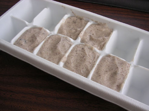 Then I had the great idea to use an ice cube tray. So I scooped out the pudding and put them into the ice tray’s slots. I let them sit in the freezer for a couple of hours and they turned into frozen pudding goodness.